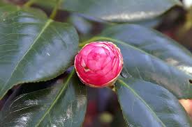 April Tryst Camellia is an evergreen shrub with deep red spring blooms and glossy foliage, ideal for protected, partially shaded gardens.